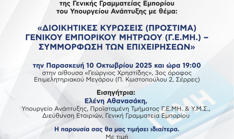 Το Επιμελητήριο Σερρών σάς προσκαλεί στην ενημερωτική εκδήλωση που διοργανώνει σε συνεργασία με τη Διεύθυνση Εταιριών της Γενικής Γραμματείας Εμπορίου του Υπουργείου Ανάπτυξης με θέμα: «ΔΙΟΙΚΗΤΙΚΕΣ ΚΥΡΩΣΕΙΣ (ΠΡΟΣΤΙΜΑ) ΓΕΝΙΚΟΥ ΕΜΠΟΡΙΚΟΥ ...