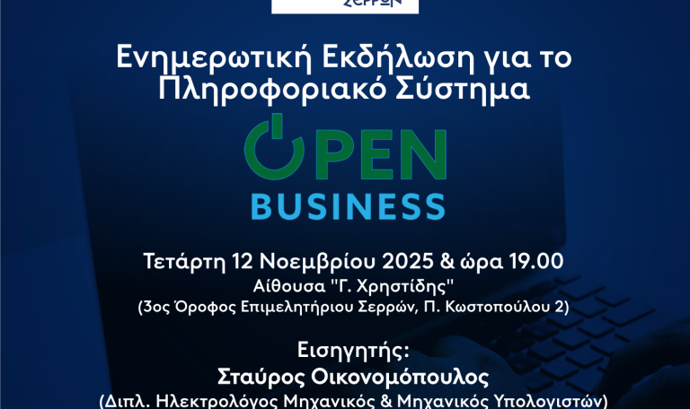 Το Επιμελητήριο Σερρών σε συνεργασία με τη Νομαρχιακή Επιτροπή Ν. Σερρών του Τεχνικού Επιμελητηρίου Ελλάδος / Τμήμα Κεντρικής Μακεδονίας διοργανώνουν ενημερωτική εκδήλωση που αφορά στο Πληροφοριακό Σύστημα “Open Business”. Η ...
