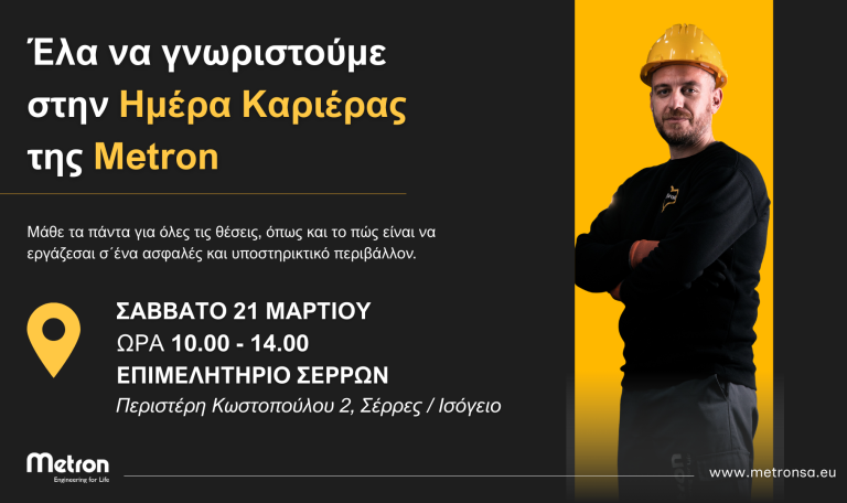 Η Μέτρον ΑΕ, μία από τις πιο δυναμικά αναπτυσσόμενες βιομηχανίες ανελκυστήρων στην Ευρώπη, διοργανώνει Ημέρα Καριέρας το Σάββατο 21 Μαρτίου, ώρα 10.00-14.00, στο Επιμελητήριο Σερρών (Περιστέρη Κωστοπούλου 2, Σέρρες), και ...
