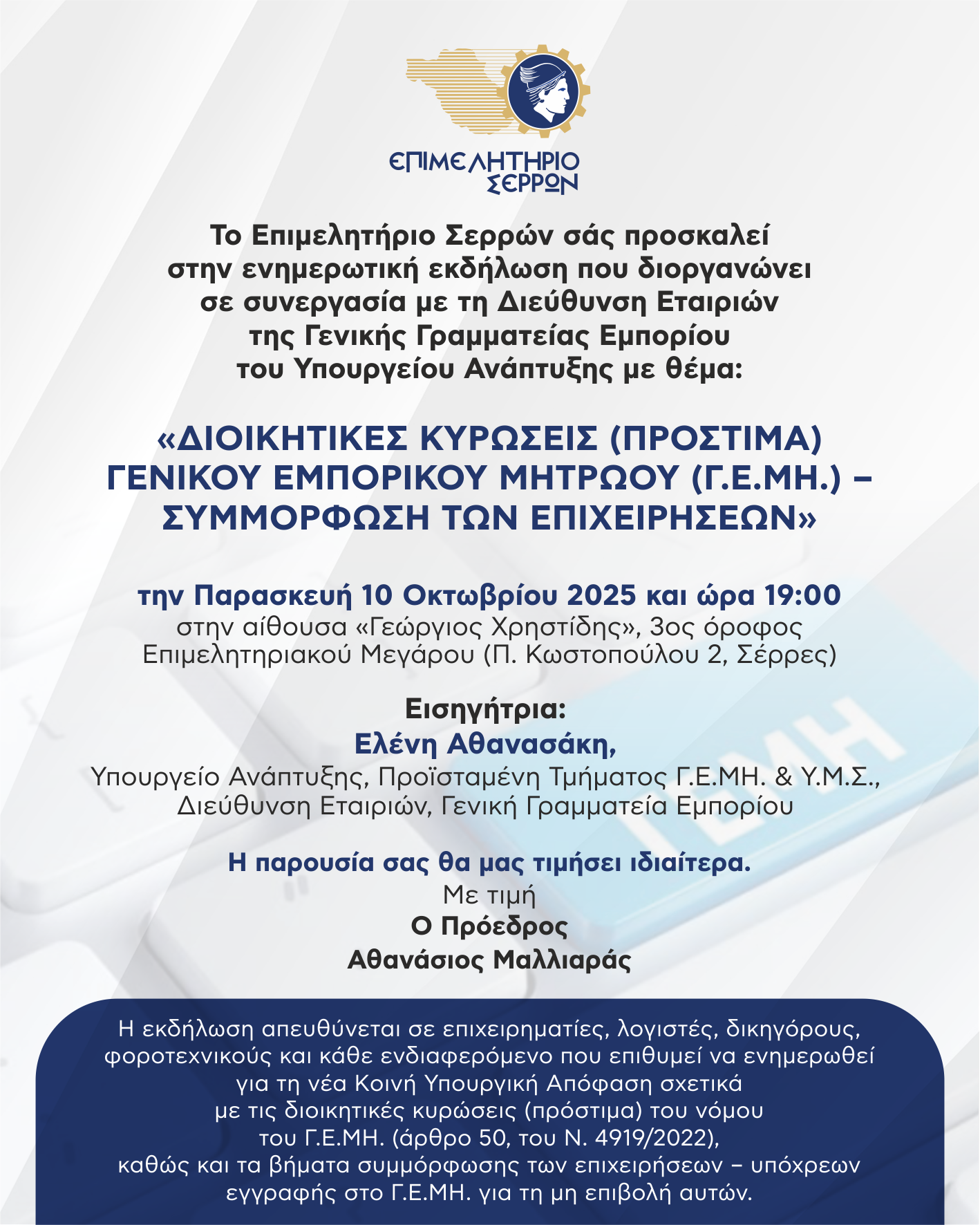 Το Επιμελητήριο Σερρών σάς προσκαλεί στην ενημερωτική εκδήλωση που διοργανώνει σε συνεργασία με τη Διεύθυνση Εταιριών της Γενικής Γραμματείας Εμπορίου του Υπουργείου Ανάπτυξης με θέμα: